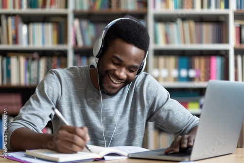 student, studying, laptop, earphones, smiling, writing, learning, education, library, book, notebook, concentration, academic, cognition, young adult, male, joyful, focused, technology, research, casual clothes, workspace, relaxation, productive