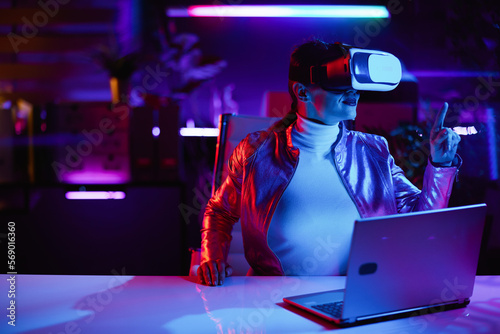 neon, goggles, helmet, inside, user, hand, female, office, girl, video game, technology, woman, desk, business, white, night, education, smile, science, simulation, people, indoor, notebook, innovation, application, cyberspace, artificial intelligence, laptop, professional, mobile, light, headset, ar, digital, entrepreneur, online, modern, work