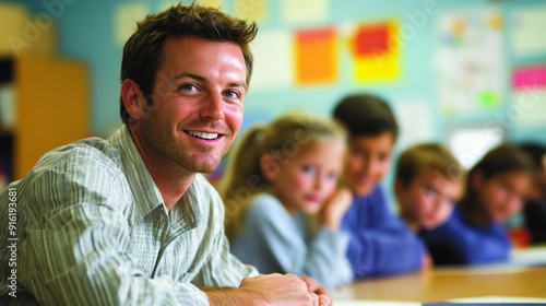 Smiling Teacher in Classroom with Students.