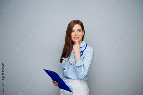 doctor, thinks, woman, smile, isolated, medicine, adult, person, nurse, portrait, uniform, stethoscope, clipboard, copy space, cheerful, happy, studio, one person, medicare, young, confidence, coat, healer, white, surgeon, insurance, men at work, girl, lady, student, shirt, blue, hair, long, grey, practice, ambulance, clinic, emergency, care