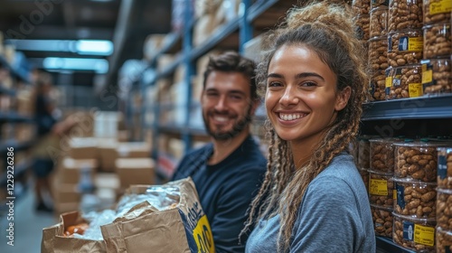 Smiling Volunteers Sorting Food Donations in Warehouse