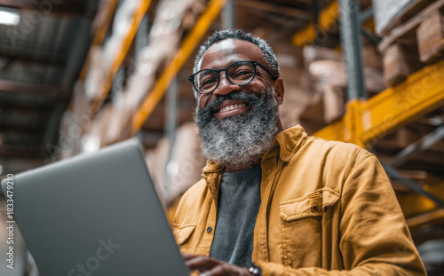 warehouse, manager, laptop, storage, facility, smiling, professional, confident, african american, beard, goggles, technology, work, business, indoor, shelf, inventory, teamwork, logistic, industry, modern, casual attire, clothing, communication, productivity, employee, workspace, operation, organisation, planning, success, leadership, engagement, connection, strategy, efficiency, tool, equipment, service, support