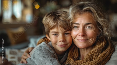 Smiling woman and a young boy embrace warmly in a cozy, indoor setting with soft lighting