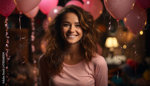 Smiling woman enjoys birthday party, holding balloon, looking at camera generated by AI