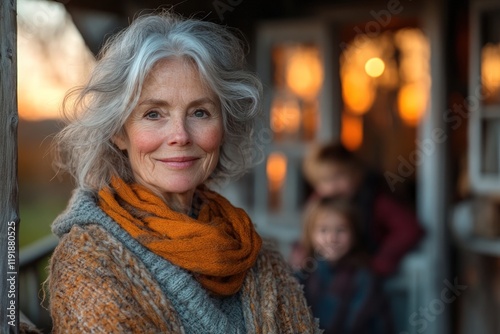woman, smiling, grey, hair, older, adult, senior, autumn, sunset, cosy, warm, foulard, orange, knit up, sweater, cardigan, porch, home, family, children, blurred, background, light, happy, relaxed, comfortable, outside, wooden, rustic, portrait