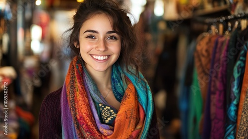 Smiling Woman in a Colorful Scarf in a Clothing Store