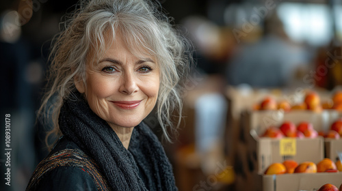 woman, market, fruit, smiling, grey hair, cheerful, outdoors, afternoon, colourful, shopping, community, selection, organic, seller, stall, local, happiness, produce, lifestyle, natural, healthy, enjoyment, agriculture, people, social, interaction, urban, accessory, foulard, warm, casual attire, fresh, nature, farmer, relaxation, choice, generative, ai