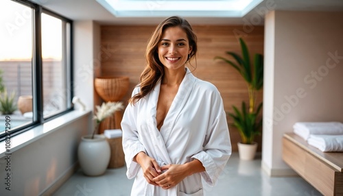 Smiling woman in a white robe enjoying a peaceful spa day in a bright, modern wellness center, radiating relaxation and tranquility