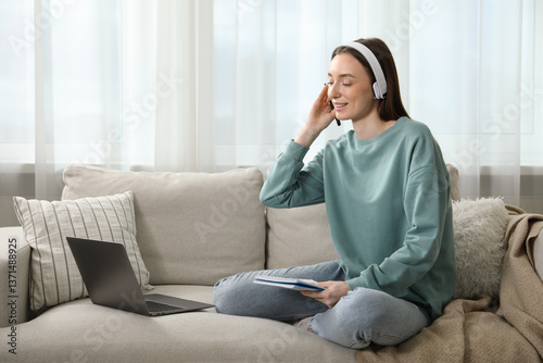 Smiling woman learning online using laptop on sofa indoors. Self-study