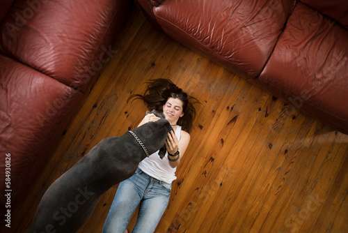 Smiling woman lying on the floor caressing big dog