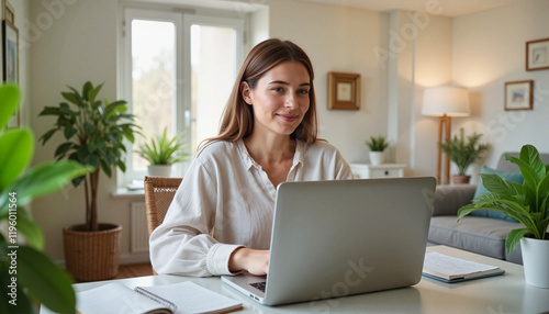 freelancer, woman, smiling, laptop, modern, living room, plant, afternoon, home office, success, cosy, communication, workspace, professional, tech, ambience, light, support, casual attire, adult, young, cheerful, sitting, closeup, indoor, productivity, connection, sharpened, comfort, well-being, happiness, natural, greenery, decor, relaxed, tied-up, lifestyle, interaction, meeting, 1, contemporary, elegant, inspiration, virtual, home, balance