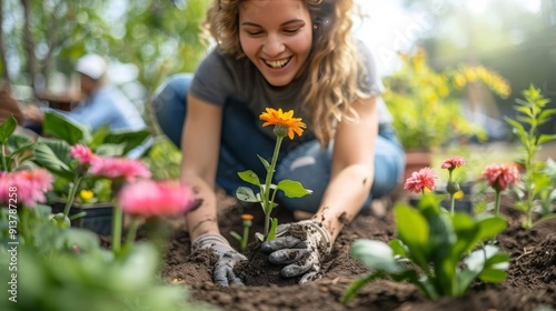 Smiling woman planting flowers in a garden on a sunny day, enjoying nature
