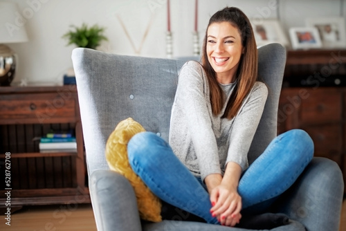 Smiling woman portrait while relaxing at home
