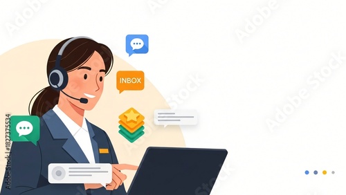 customer service, client, online, virtual, agent, help, support, service, assistant, woman, headset, laptop, communication, digital, chat, inbox, professional, workplace, technology, business, interface, icon, graphic, illustration, vector, flat, design, remote, work, call, center, operator, representative, smile, happy, efficiency, solution, aid, connection, interaction, computer, screen, adviser, specialist