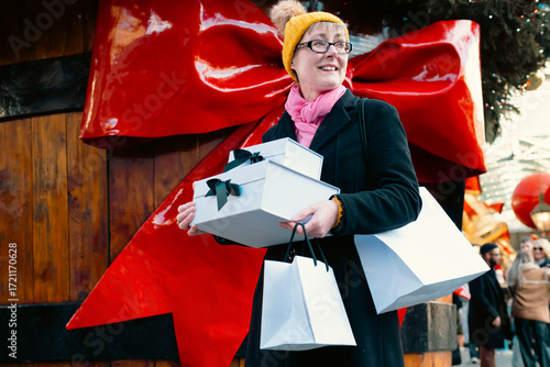 Smiling woman shopping with gift boxes and bags in festive London