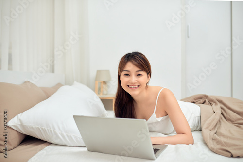 missy, comfortable, relaxing, chinese, japanese, typing, bedchamber, attractive, notebook, computer, laptop, happy, young, woman, bed, home, technology, indoor, hair, using, lying, female, white, beautiful, portrait, smiling, casual attire, looking, household, china, thai, asian, vietnamese, korean