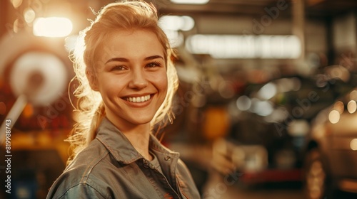 woman, smiling, young, blond, garage, hair, confident, expression, casual attire, attire, setting, standing, jacket, denim, bright, approachable, background, vehicle, blurred, relaxed, equipment, industrial, cheerful, happy, pose, friendly, attractive, sunlight, adult, day