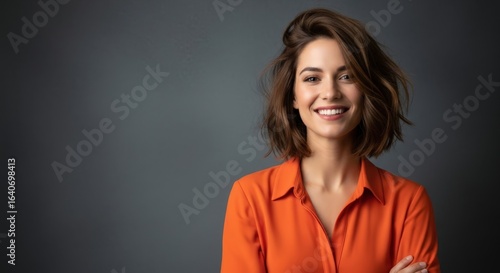 woman, person, female, young, adult, caucasian, hair, brown, smile, happy, joyful, confident, friendly, portrait, head shot, studio, grey, dark, clothing, shirt, orange, casual attire, business, professional, model, face, beauty, attractive, looking