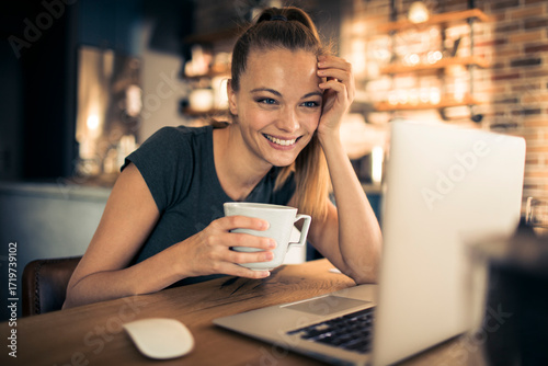 people, woman, hot drink, laptop, smiling, emotion, home, lifestyle, technology, modern, work, relaxation, happiness, joy, sitting, casual attire, indoor, communication, connection, sharpened, productivity, enjoyment, leisure, personal, cosy, workspace, digital, young, female, lifestyle, beverage, caffeine, comfort, creativity, innovation, freelancer, remote, professional, motivation, inspiration, calmness, serenity, chill, study, home office, entrepreneur, copy space