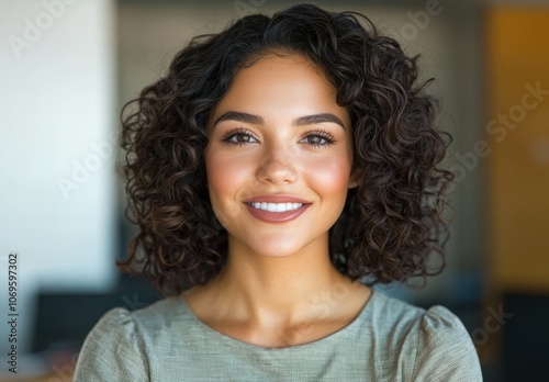 woman, curly hair, smile, portrait, head shot, beauty, make-up, fashion, female, young, attractive, happy, positive, confident, natural, skin, eye, eyebrow, lip, expression, emotion, lifestyle, people, photo, smiling woman, happy woman, natural beauty, eye contact, young adult