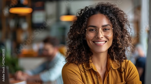 Smiling woman with curly hair in glasses sitting at a cafe with warm lighting and a relaxed atmosphere