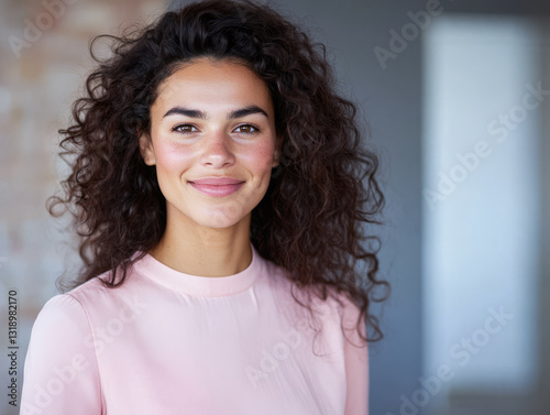 woman, curly, hair, smile, indoor, portrait, natural, beauty, positive, attitude, warm, expression, friendly, soft, lighting, casual attire, fashion, modern, decor, pose, cheerful, confidence, aesthetic, relaxed, indoor, setting, happy, stylish, youthful, elegant, personality, simplicity, sharpened, creative, space, inviting, atmosphere, warmth, charme, lifestyle, happiness, joy, approachable, ethnic, diversity, tranquil