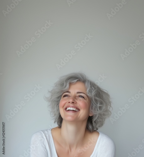 Smiling woman with gray curly hair expressing joy and happiness against a neutral background, showcasing natural beauty and confidence, copy space for text