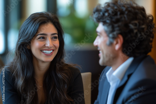 smiling, woman, man, conversation, relaxed, daytime, happy, friendly, interaction, indoor, comfortable, people, laughter, socialising, partnership, joy, connection, stylish, attire, dark hair, curl, portrait, communication, facial expression, expression, engagement, mutual, enjoyment, atmosphere, friendship, candid, companionship, warm, togetherness, intimate, sitting, dining, professional, casual attire, ambience, light, meeting, happy hour, engaged, positive, vibe, human relationships, leisure
