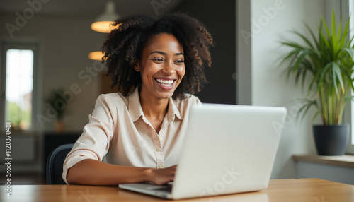 woman, happy, smiling, working, computer, laptop, business, professional, office, focused, productive, success, career, positive, technology, modern, style, content, engaged, motivated, efficient, digital, communication, online, cheerful, confident, determined, comfortable, relaxed, bright