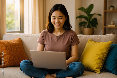 woman, asian, laptop, sofa, home, working, online, communication, technology, cyberspace, comfortable, sitting, crossed legs, relaxing, smiling, domestic life, lifestyle, living room, interior, house, apartment, modern, casual attire, connection, wireless, browsing, searching, typing, computer, freelance, self employed, entrepreneur, business, student, learning