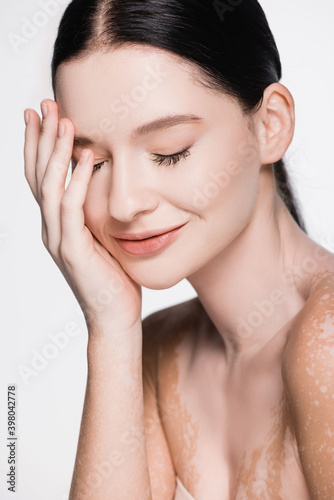 white, isolated, beautiful, happy, studio, young, smiling, adult, beauty, cheerful, portrait, caucasian, health, care, skin, emotion, woman, body, disease, problem, pigment, positive, dermatology, pigmentation, one person
