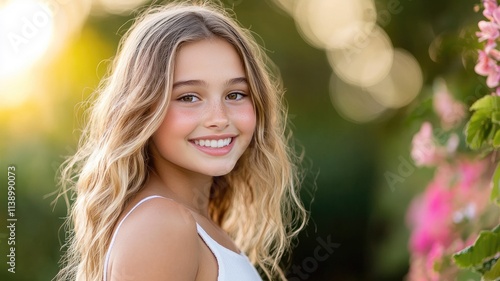 smiling, woman, blond, outdoors, sunlight, flower, young, white, dress, nature, happiness, cheerful, female, pretty, summer, portrait, beauty, greenery, garden, serene, relaxation, bright, casual attire, girl, attractive, park, fresh, glowing, joyful, radiant, spring, peaceful, hair, evening, warm, blossom, gentle, elegant, feminine, lovely, scenic, background, copy space