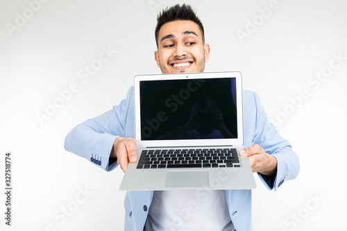 laptop, computer, young, happy, technology, using, office, professional, isolated, background, student, success, adult, men at work, looking, shirt, studio, excited, wow, network, leadership, cheerful, surfing, successful, communication, study, confident, connection, connected, advertising, holding, education, caucasian, happiness, man, man, smiling, brunette, photogenic, costume, prestigious, blue, jacket