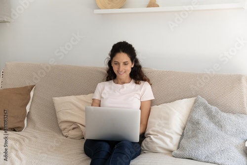 Smiling young Caucasian woman sit relax on comfortable couch in living room use laptop at home. Happy millennial female renter tenant rest on sofa, browse wireless internet on computer online.