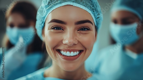 smiling young female surgeon in surgical attire looks directly at the camera with a smile