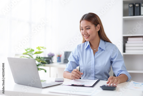 Smiling young happy Asian businesswoman working with laptop and documents in office. Accountant or beautiful asian female worker working happily in the office.