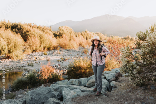 Smiling young latin woman with a hat and a backpack on, hiking in a beautiful landscape.