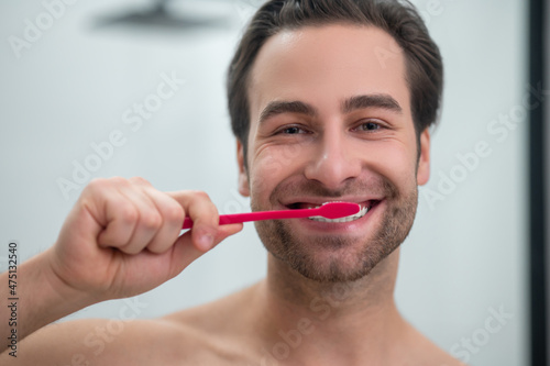 Smiling young man brshing his teeth and looking carefree