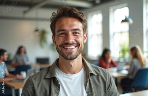 Smiling young man in coworking office looks at camera. Happy male worker on video call, web conference, using webcam for online communication with client. Portrait of caucasian employee, remote work,