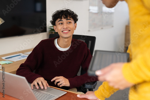 people, smiling, man, laptop, talking, partner, holding, tablet, technology, teamwork, collaboration, workspace, contraption, communication, business, office, digital, device, co-worker, colleague, discussion, brainstorming, meeting, professional, modern, cyberspace, connection, working, project, planning, innovation, corporate, job, employee, entrepreneur, startup, software, online, interaction, productivity, creative, development, strategy, consulting, management, tech, wireless, mobile
