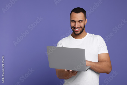 Smiling young man working with laptop on lilac background, space for text