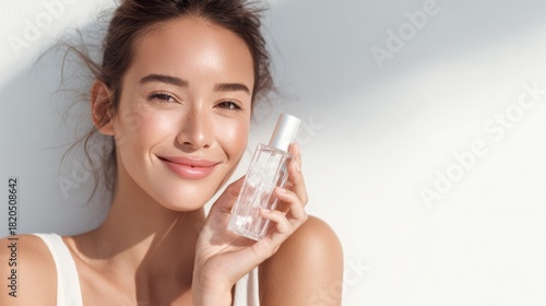 Smiling young woman holding clear rectangular glass perfume bottle against bright white background