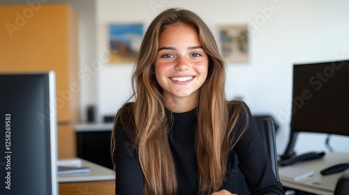 woman, young, smiling, portrait, office, desk, professional, business, happy, female, workplace, confident, modern, brown, hair, long, black, top, casual attire, indoor, positive, friendly, successful, career, corporate, employee, team, work, teamwork, collaboration, businesswoman, entrepreneur, leader, management, executive, men at work, face, cheerful, content, hopeful, optimistic, photo, head shot