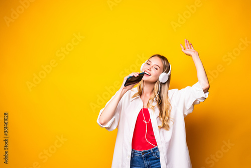 Smiling young woman listening music in headphones and using smartphone isolated over yellow background