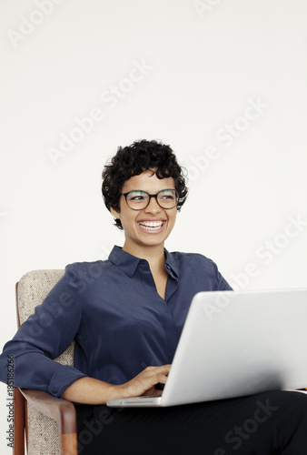 laptop, working, artist, bright, brunette, casual attire, chair, clean, comfort, comfortable, computer, confident, conversation, cool, creative, employee, entrepreneur, german, goggles, happy, hip, home, independent, leisure, loft, office, portrait, relaxation, remote, sitting, smile, smiling, strong, student, stylish, woman, copy space, mixed race, multiracial, girl, female, person, people, adult, adult, 20s, grown-up