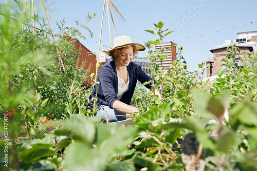Smiling young woman wearing straw hat urban gardening