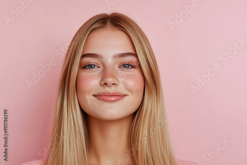 Smiling young woman with blonde long groomed hair