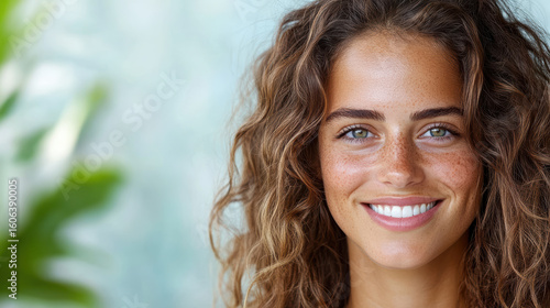 Smiling young woman with curly hair and freckles, radiating warmth and joy