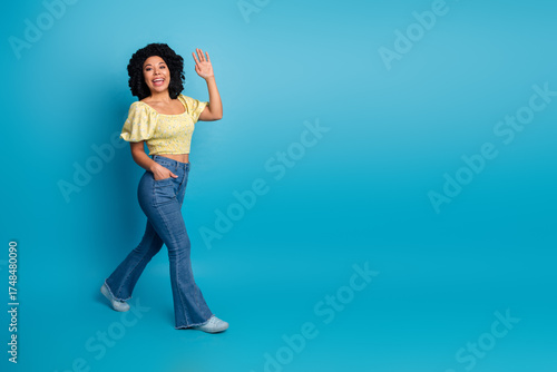 Smiling young woman with curly hair waving and walking against a vibrant blue background in casual and trendy outfit