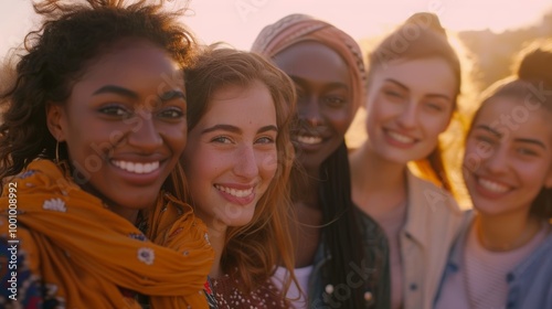 Smiling young women from various ethnic backgrounds, standing closely together and warmly